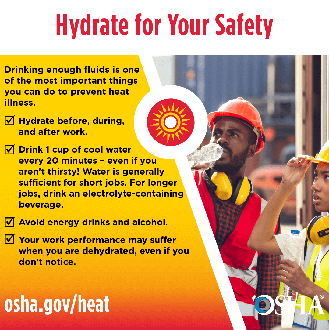 - Hydrate before, during and after work. Drink 1 cup of cool water every 20 minutes even if you aren’t thirsty. For longer jobs, drinks with electrolytes are best. Avoid energy drinks and alcohol.