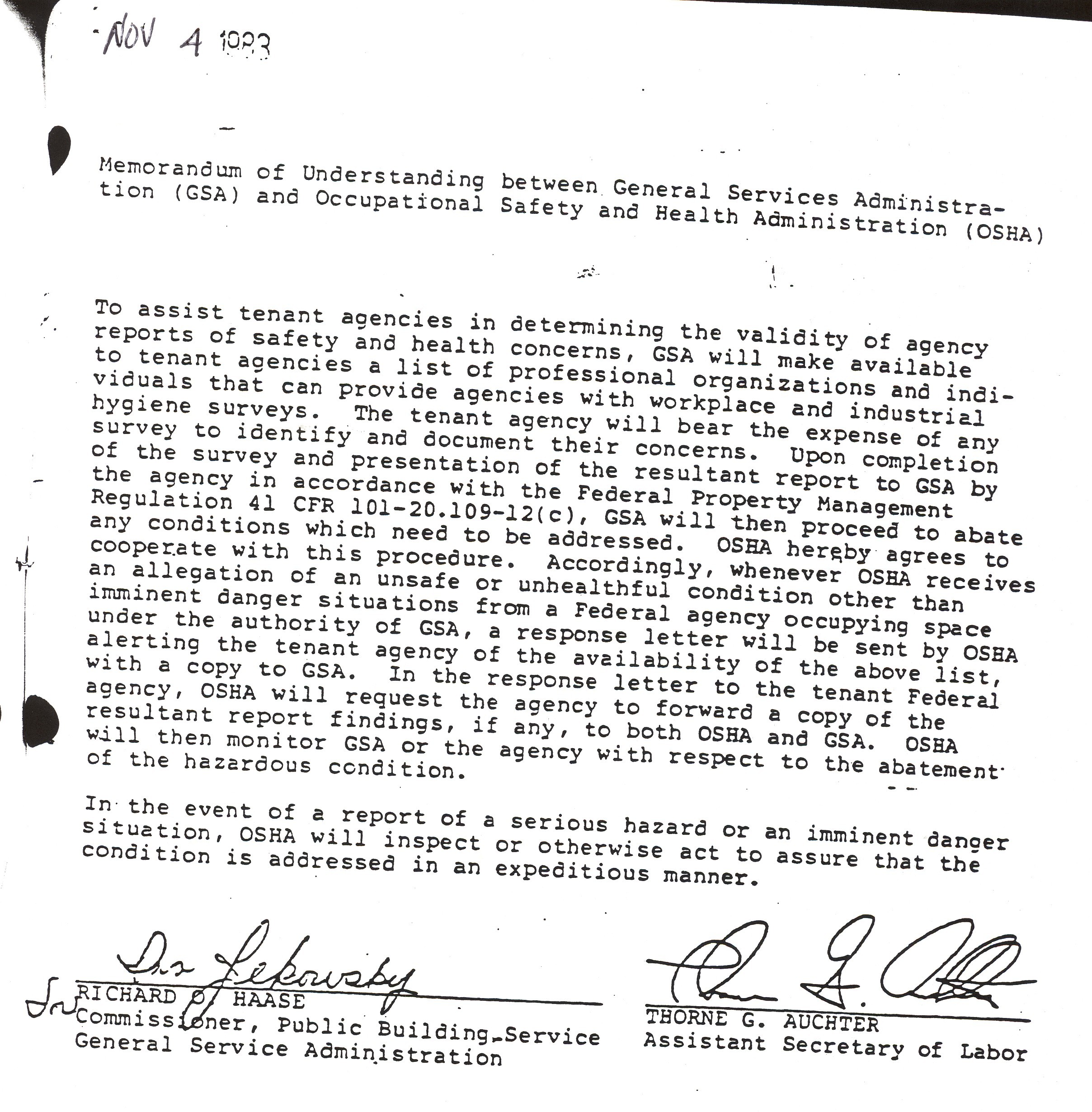To assist tenant agencies in determining the validity of agency reports of safety and health concerns, GSA will make available to tenant agencies a list of professional organizations and individuals that can provide agencies with workplace and industrial hygiene surveys. The tenant agency will bear the expense of any survey to identify and document their concerns. Upon completion of the survey and presentation of the resultant report to GSA by the agency in accordance with the Federal Property Management Regulation 41 CFR 101-20.109-12(c), GSA will then proceed to abate any conditions which need to be addressed. OSHA hereby agrees to cooperate with this procedure. Accordingly, whenever OSHA receives an allegation of an unsafe or unhealthful condition other than imminent danger situations from a Federal agency occupying space under the authority of GSA, a response letter will be sent by OSHA alerting the tenant agency of the availability of the above list, with a copy to GSA. In the response letter to the tenant Federal agency, OSHA will request the agency to forward a copy of the resultant report findings, if any, to both OSHA and GSA. OSHA will then monitor GSA or the agency with respect to the abatement of the hazardous condition.