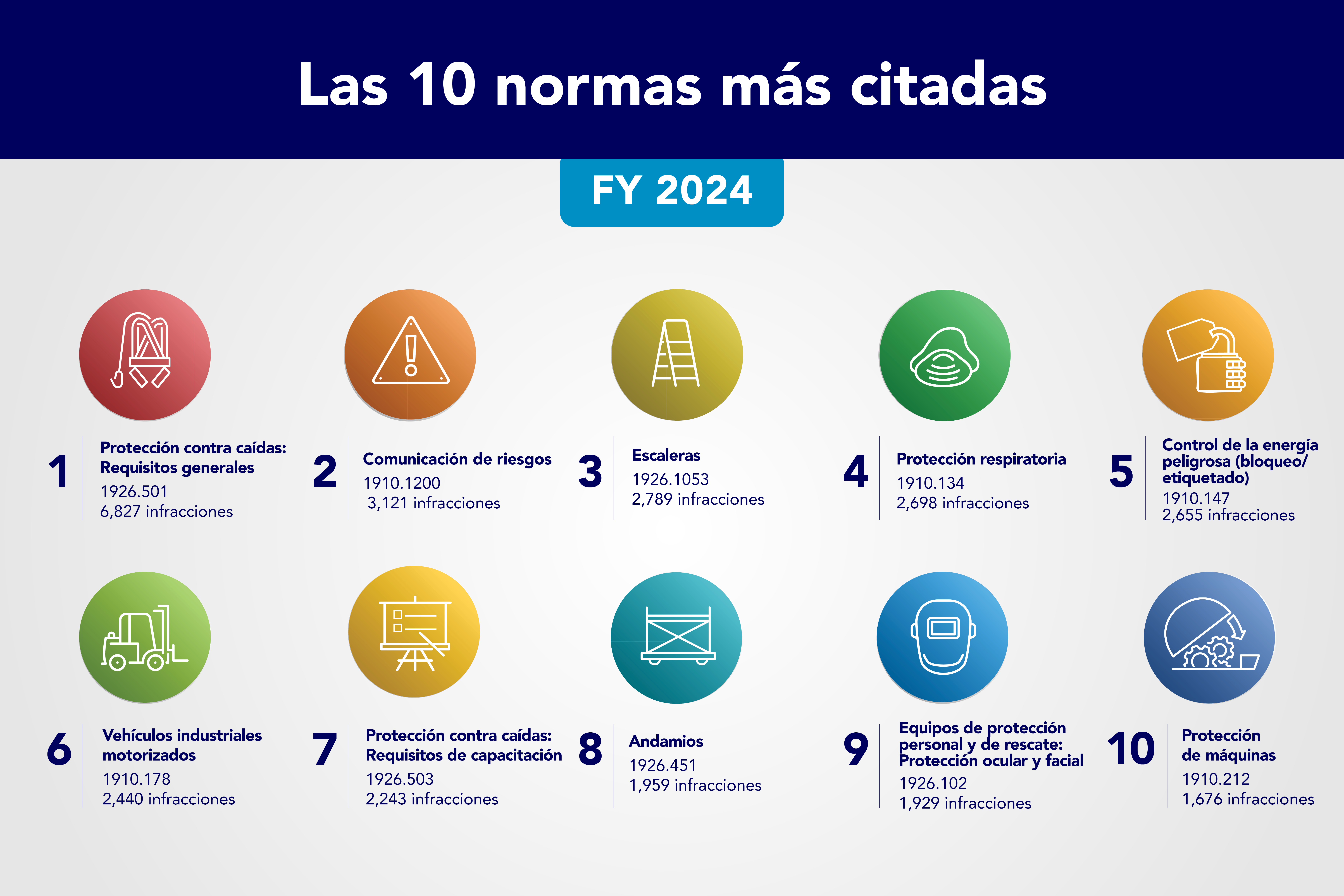 The following is a list of the top 10 most frequently cited standards following inspections of worksites by federal OSHA for all industries. OSHA publishes the list to alert employers about these commonly cited standards so they can take steps to find and fix recognized hazards addressed in these and other standards before OSHA shows up. Workers suffer preventable injuries, illnesses, and deaths related to the hazards addressed in these standards.