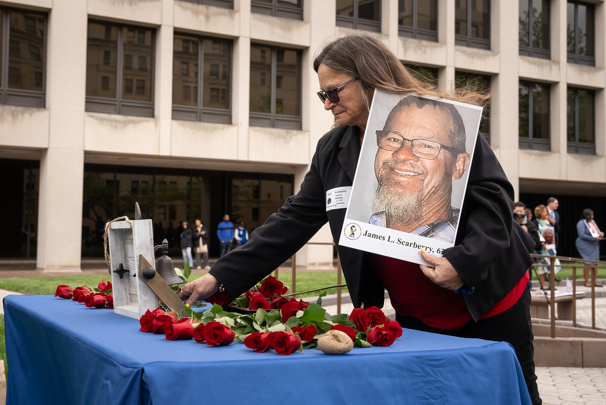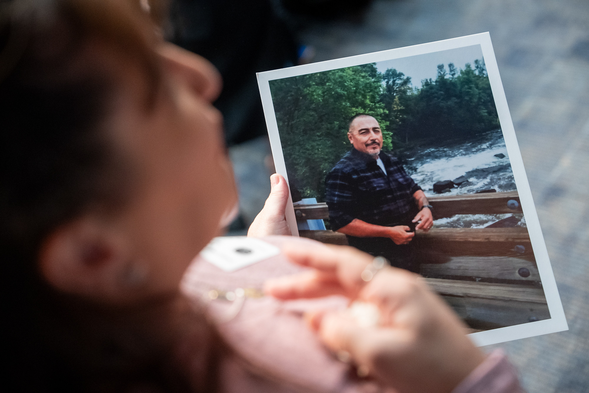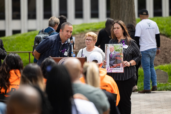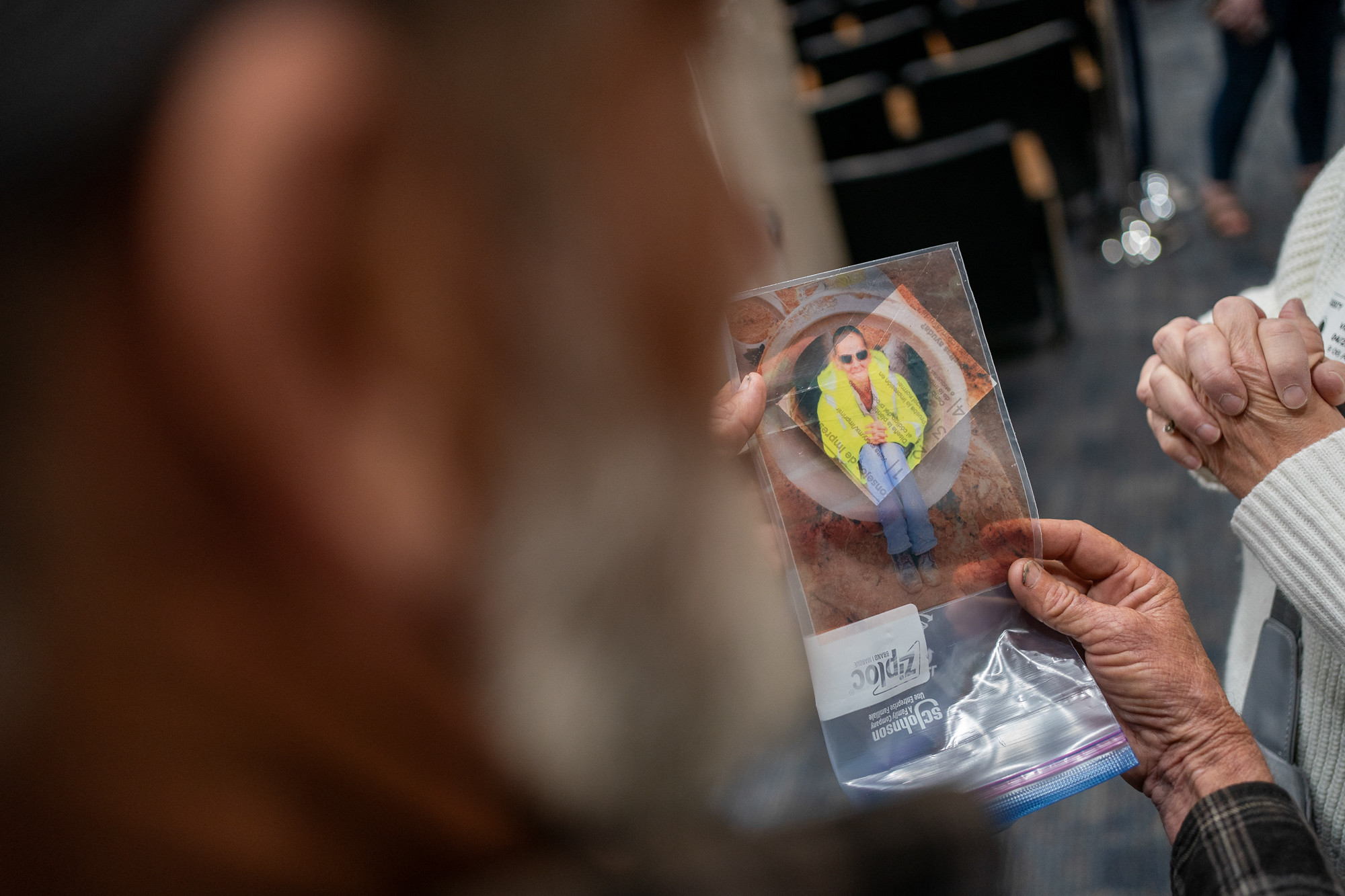 A picture is worth a thousand words. Photograph of fallen worker Shawn J. Pedregon, 51 of Texas held by his wife Christine Waukau Pedregon as she hears the stories of other fallen workers.
